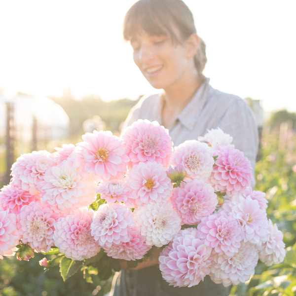 The best-selling item on the farm, loved by all brides, it fits beautifully into arrangements. Giant-sized flowers with a soft powdery hue, sometimes leaning pink. There isn't a softer color in the dahlia field.