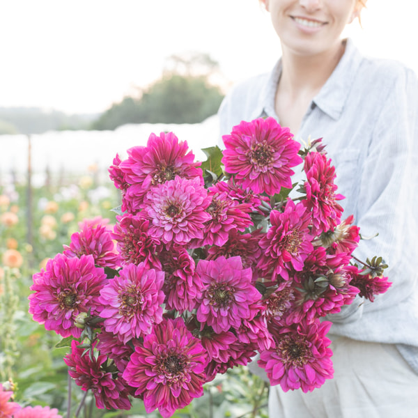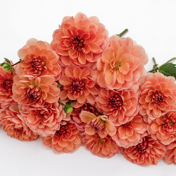 The best-selling item on the farm, loved by all brides, it fits beautifully into arrangements. Giant-sized flowers with a soft powdery hue, sometimes leaning pink. There isn't a softer color in the dahlia field.