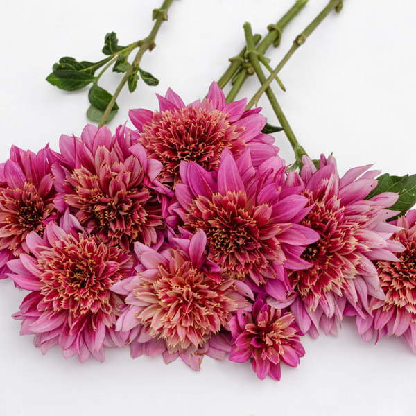 The best-selling item on the farm, loved by all brides, it fits beautifully into arrangements. Giant-sized flowers with a soft powdery hue, sometimes leaning pink. There isn't a softer color in the dahlia field.