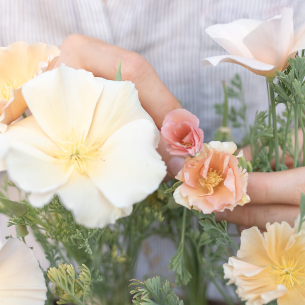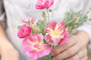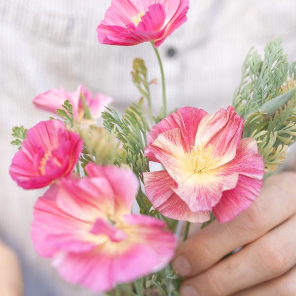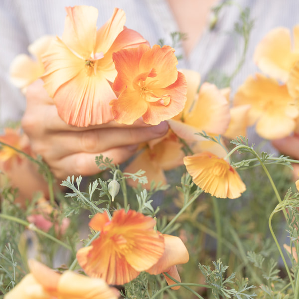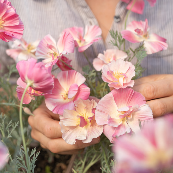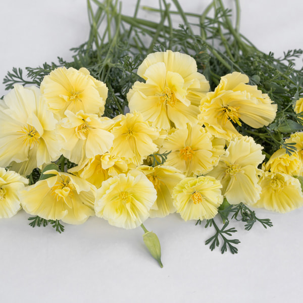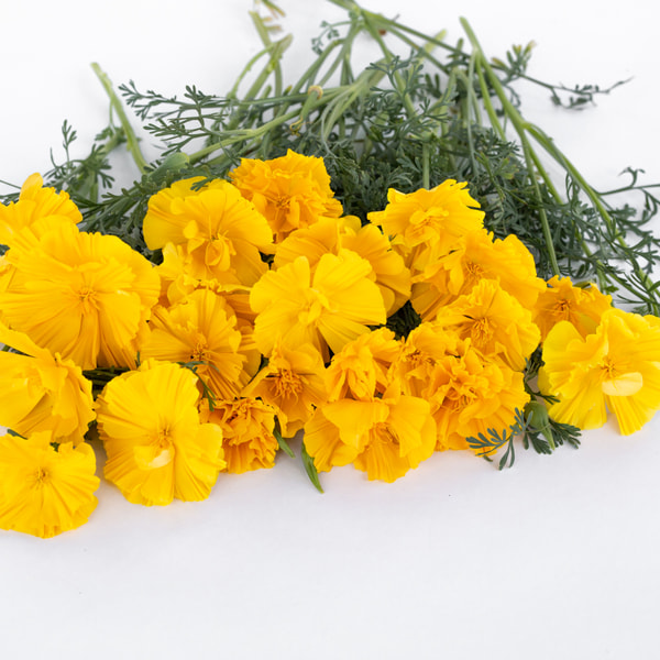 We recommend California poppy for sunny beds; it tolerates heat and drought. We use it mainly for wedding floristry because it is wonderfully original. It isn't well-suited for arranging standard market bouquets, as the stems aren't very strong and harvesting takes longer. Gold Swirl is a double-flowered variety of the classic orange California poppy.
